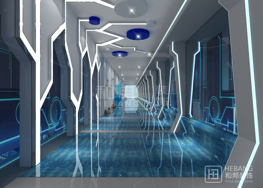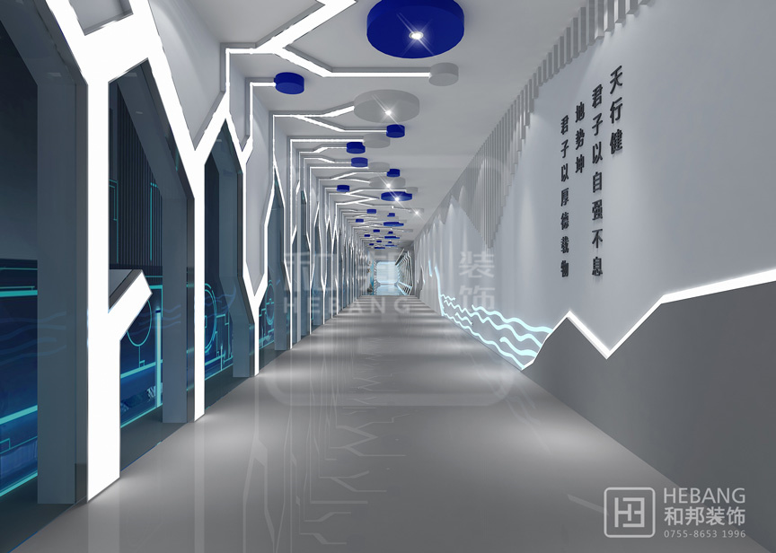 設(shè)計(jì)說明藍(lán)色貫穿于整個(gè)設(shè)計(jì)前后,讓人感覺干凈整潔。墻壁飾有的古代名言警句以及極富現(xiàn)代科技感的線條,行走在其中,像是穿越了古今,讓人流連往返。