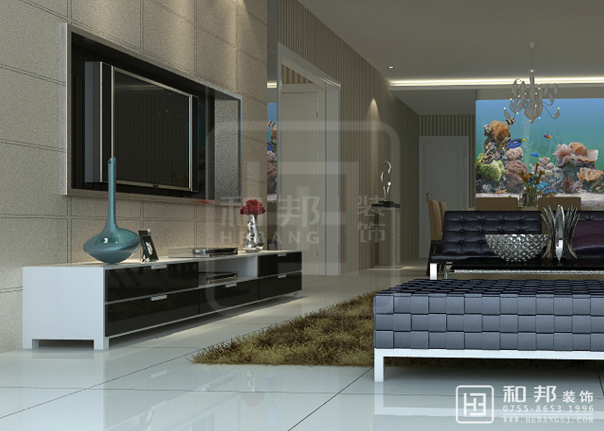 客廳的沙發墻面的線條與電視墻的墻面有著“天輕地重”的舒適視覺感,抱枕使用了紫色,與黑色沙發的相得益彰很舒適、溫和,這種裝飾效果形成對比的層次美感。