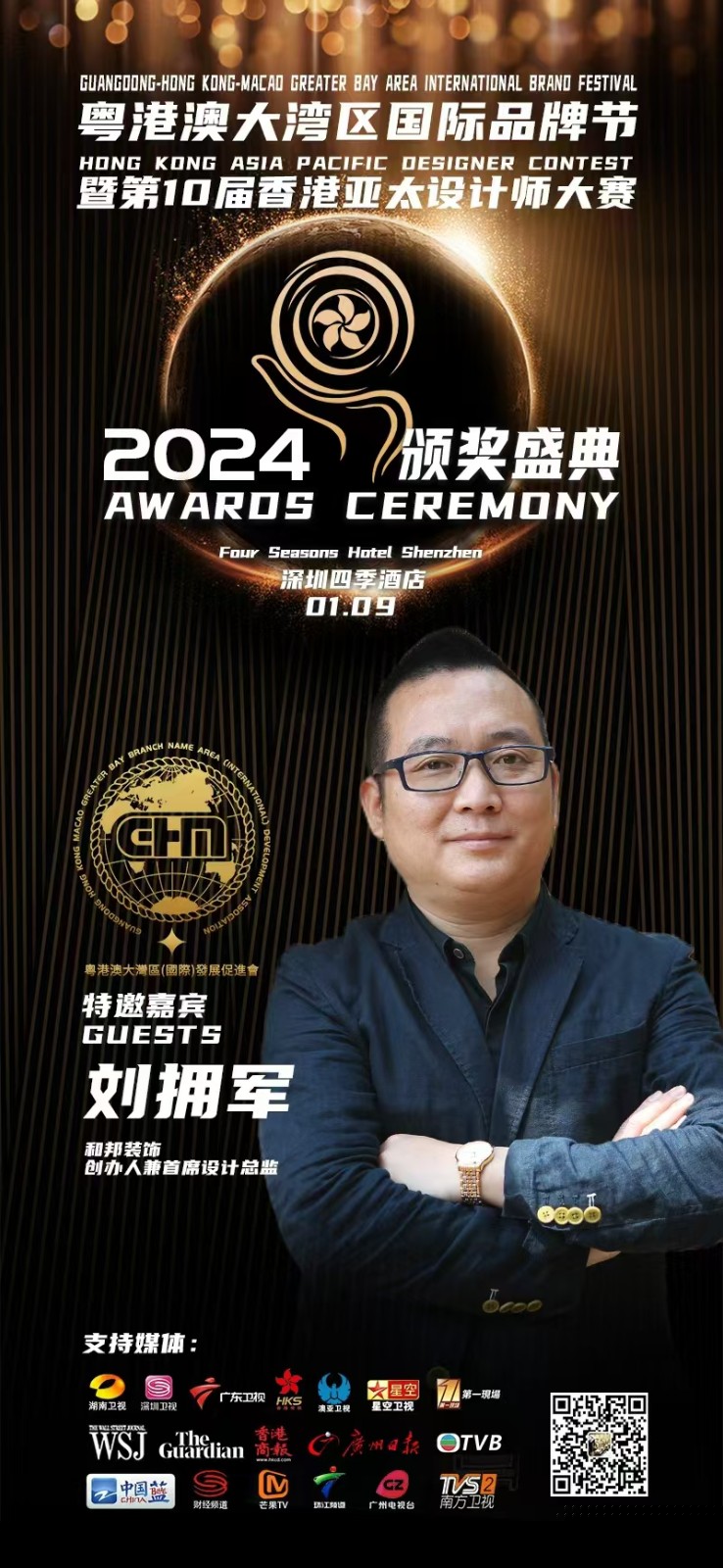 2025 年 1 月 19 日,2024 粵港澳大灣區(qū)國際品牌節(jié)暨第十屆香港亞太設計頒獎盛典在深圳福田區(qū)福華三路 138 號深圳四季酒店隆重舉辦。和邦設計創(chuàng)始人劉擁軍作為特邀嘉賓出席此次盛會,彰顯了其在設計領域的專業(yè)影響力。